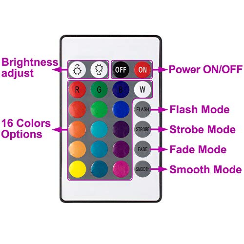 Remote control: With the provided remote controller, you can easily change colors, brightness or modes with a press of the button(remote control distance up to 16-26ft) .