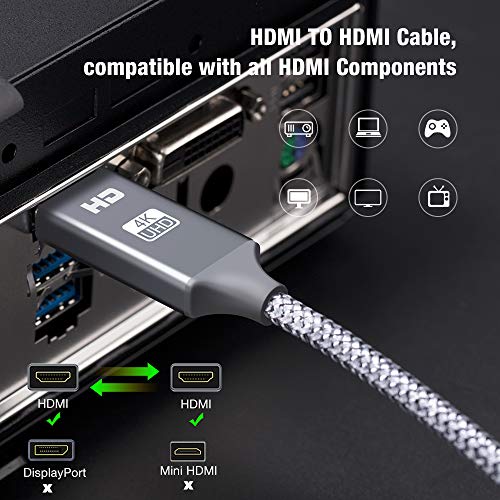 ⚡【4k HDMI Cable】: Features an ultra-durable nylon-braided jacket with a bend lifespan of 6000+ and High quality 24K gold plated connectors,This hdmi cord is perfect for any desk or entertainment setup, and is guaranteed to last in long term applications.(PS:The 4k Logo is printed on the aluminum shell which is wrapped around by a piece of plastic film to protect the shell from scraching ,feel free to remove the film when you use it.)