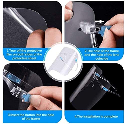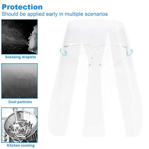 # Full Face Protection: Our face shield with a flexible wrap-around design,which provides side and front face protection,with 180 degree of protection,which provides a full coverage of eyes,nose,and mouth,to help prevent droplets of saliva,coughs,sneeses,hot oil splash,and other foreign substances from reaching your face.