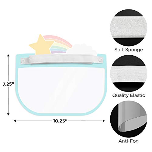 Children’s Face Shield is approximately 7.25 in x 10.25 in. Shield is made of lightweight 100% Polyethylene Terephthalate.