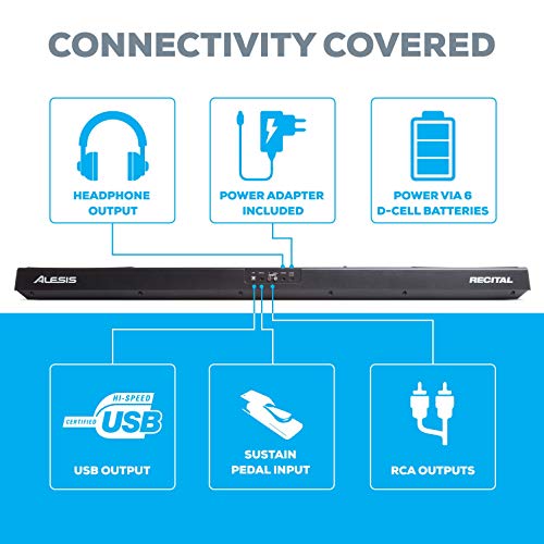 The Alesis Recital is a full-featured digital piano with 88 full-sized semi-weighted keys with adjustable touch response. The Recital features 5 realistic built-in voices: Acoustic Piano, Electric Piano, Organ, Synth, and Bass. Customize the voices by combining any two at once in Layer Mode for a full, rich tone. They can also be assigned to only the left or right hands in Split Mode. You can even add adjustable Reverb and Chorus to further tailor your sound. With powerful 20-watt built-in speakers and a 128-note maximum note polyphony, Recital delivers ultra-realistic sound and a great playing experience.