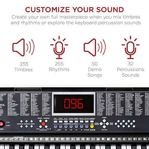 STANDARD SIZE ELECTRONIC KEYBOARD: Complete with 61 keys, 255 timbres, 255 rhythms, 50 demo songs, and 8 types of keyboard percussion to create versatile, quality music