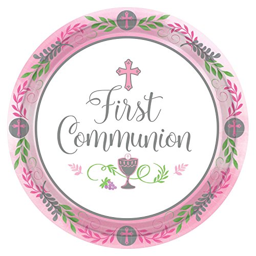 Serve up a Holy feast on their Blessed day using these girl’s first Communion dinner plates! Made of paper, these plates feature a pink border that is complete with branches and crosses. To complete the design of these large plates, “first Communion” Is written between a cross and the Eucharist against a white background. Make your religious party One to remember with these large paper plates!