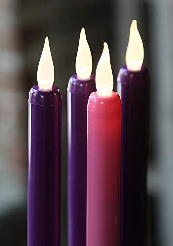 Battery operated Advent taper candle set includes 3 purple flameless tapers and 1 pink flameless taper. Safe battery operated Advent candles. Candles are 9 inch high and made of durable plastic. Flexible adapter at the base helps our taper candles fit into virtually any taper candle holder. Flickering warm white LED flame.