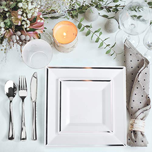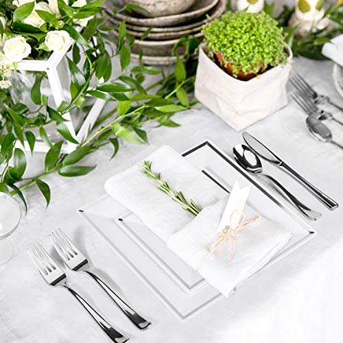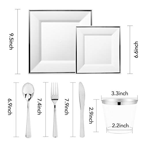 Glotoch 150 Pcs Silver Square Plates & Disposable Silverware & Plastic Cups, Silver Plastic Dinnerware set Include: 25…