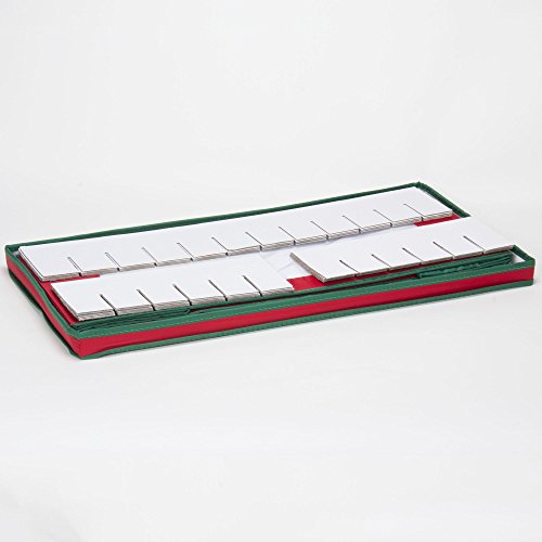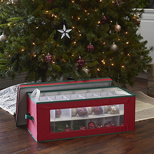 Household Essentials Holiday Ornament Storage Box is a long storage box with adjustable compartments that holds up to 36 of your special ornaments! The box comes with 2 layers of protected storage with 1 lift-out tray for easy unpacking. This festive red and green holiday storage box has a clear front window vision panel that lets you see inside the box to know which ornaments are in it without unpacking! This longer box is customizable, with heavy-stock cardboard dividers that adjust to fit small ornaments and large finials, so each memory-filled ornament is shielded from jostling during packing, unpacking, and transport. And with riveted handles and reinforced stitching supports up to 25 pounds. Festively attired in red and green, these boxes will soon be as much a part of your holiday tradition as the special collectibles they contain. The box has 2 layers, holds up to 36 ornaments, and measures 10 inches high, 27 inches wide, and 13.5 inches deep.