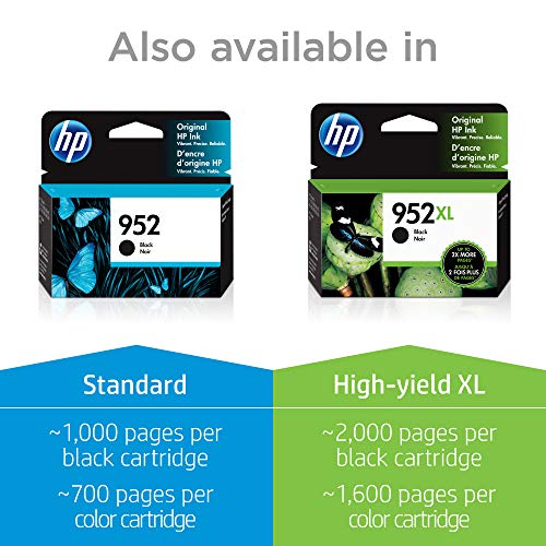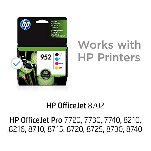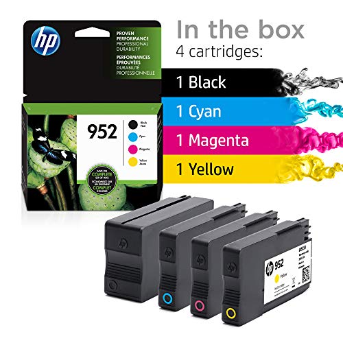 HP 952 Black, Cyan, Magenta & Yellow Ink Cartridges, 4 Cartridges (F6U15AN, L0S49AN, L0S52AN,L0S55AN). HP 952 ink cartridges work with: HP OfficeJet Pro 7740, 8702, 8710, 8715, 8720, 8725, 8730, 8740. Cartridge yield (approx.) per cartridge: 1,000 pages black, 700 pages cyan, 700 pages magenta, 700 pages yellow. Savings up to 5% with HP 4-packs. Up to 2x more prints with Original HP ink vs refill cartridges. Ensure that your printing is right the first time and every time with HP printer ink: 952 ink. CHOOSE AN INK REPLENISHMENT SERVICE – Let your printer track usage and have ink delivered before you run out. Either reorder HP Genuine ink cartridges only when you need them through Amazon Dash Replenishment, or save up to 50% by paying for pages printed through HP Instant Ink. What’s in the box: 1 New Original HP 952 pack of 4 ink cartridges (X4E07AN) . Color: Black, Cyan, Magenta, Yellow.Ink drop: 10.5 pl (black), 7 pl (cyan, magenta, yellow). Operating temperature range: 41 to 95°F