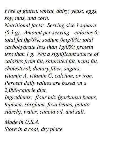 This product is a small 3/8″ x 3/8″ inch piece of gluten-free communion bread that is individually wrapped to prevent cross-contamination. Only the best quality ingredients are used, resulting in a great taste! Free of gluten, wheat, dairy, yeast, eggs, soy, nuts, and corn. People with severe allergies can partake freely and without worry. Ingredients: flour mix (garbanzo beans, tapioca, sorghum, fava beans, potato starch), water, canola oil, and salt. Made in the United States of America. Not for use in the Catholic Church