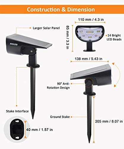 💎 Unique Design & IP67 Waterproof: With 90°lighting angle and 90°adjustable solar panel & Made of high strength ABS plastic and ensure a higher waterproof grade than regular landscape spotlight. With up67 waterproof, heat resistant and frost resistant, JESLED solar spot light can fit for all kinds of terrible weather.