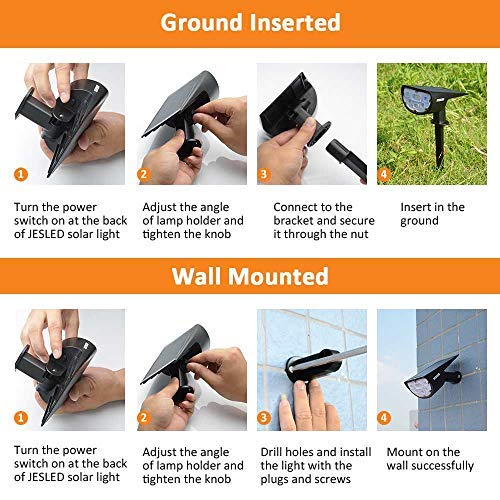 💎 2 Easy Installation Methods: Stick into the ground with stakes & Mount on the wall with the screws included. JESLED solar landscaping lights are perfect for Yard, Patio, Porch, Path, Deck, Pool, Garden, Garage, Driveway, Pathway, Security Wall Light, etc.