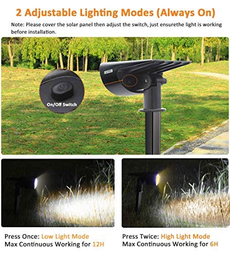 💎 2 Brightness Modes (Always on) & Dusk-to-Dawn: Low Light Mode(12hrs) / High Light Mode(6hrs). JESLED outdoor spot lights solar powered can automatically detect changes in the brightness outside. When the brightness is low enough to require illumination, it will automatically switch from charging mode to glowing mode without motion detection (Auto On in the evening / Auto Off in the daytime).