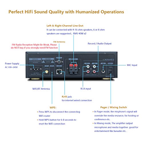 [Strong Compatibility & Practicability] Work with all devices which is with an analog output via RCA/AUX cable. This stereo amplifier also supports various resources including 1/4” wired microphone, USB flash drive. Adjustable L/R balance & EQ option: Country/Pop/Jazz/Rock/Classic/Normal.