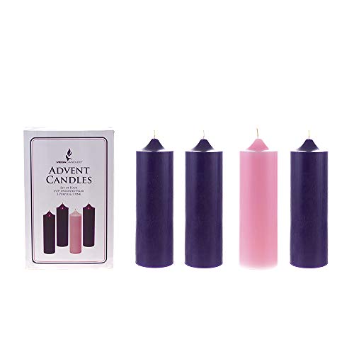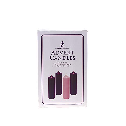 GET A GREAT MONEY SAVER CANDLES SET of 4 unscented 3” x 9” Christmas Advent candles, 3 Purple and 1 Pink, in a handy storage box. Save money on buying separately on your advent candles!