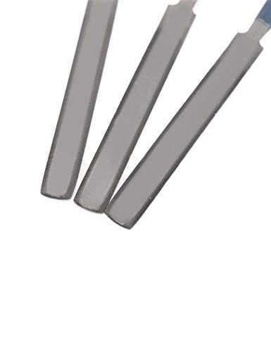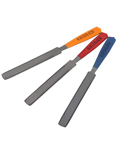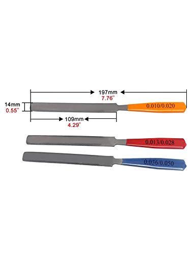Gauged edges: 0.010″/0.020″, 0.013″/0.028″ and 0.036″/0.050″, these files have been designed to be slightly narrower than the nut size specified to keep the file from binding in the slot, carbon steel T12 material; Overall length 197mm(7.76in), file surface length 109mm (4.29in).