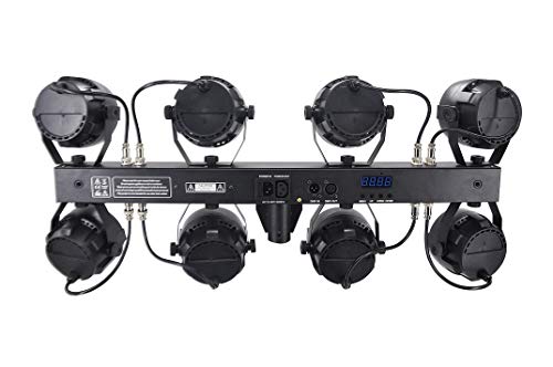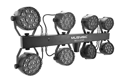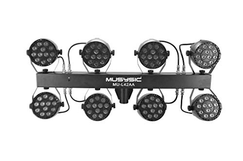 MUSYSIC MU-L42AA Professional complete lighting system 8-Par fitted with high-intensity four color (RGBW) Stage LEDs that can be controlled by DMX and remote control. A convenient tripod stand is included for quick and easy setup and tear down.