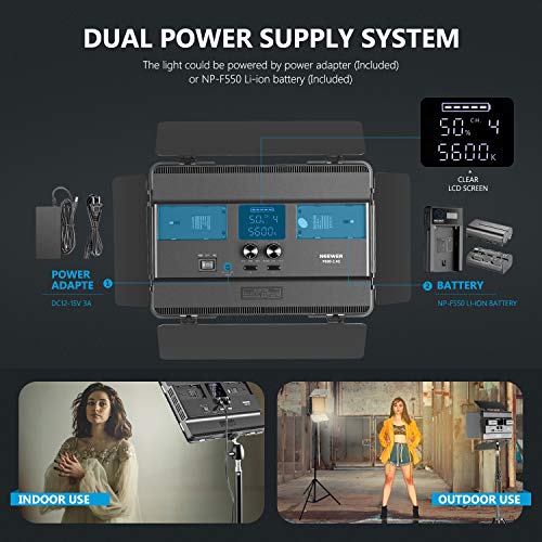 2 POWER OPTIONS: The light could be powered by power adapter (Included) or NP-F550 Li-ion battery (Included). 4 Packs High capacity of 2200mAh, rechargeable DC 7.4V Li-Ion battery with premium cell and 2 USB charger included for convenient work