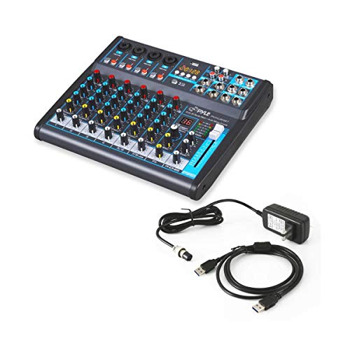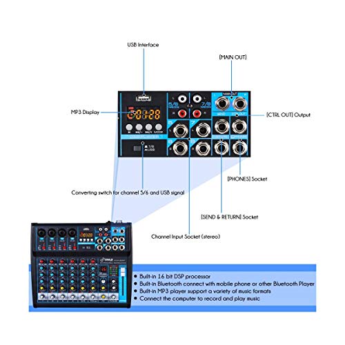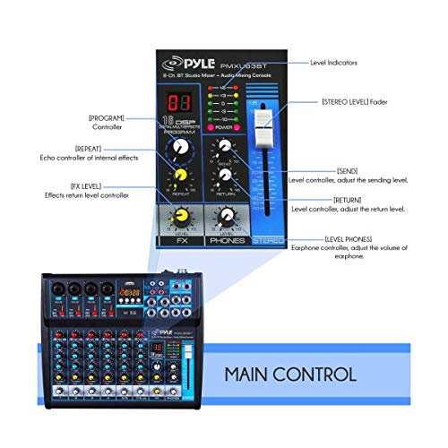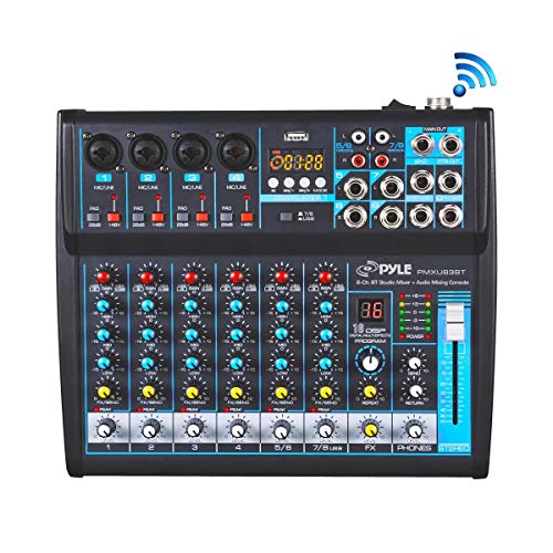 The Pyle 8Ch. Bluetooth Studio Mixer DJ Controller Audio Mixing Console System DJ & Studio Console Mixer System Multi 8Channel Audio Source Mixing Builtin Bluetooth Wireless Receiver FX (Analog Effects) & 16 Bit DSP processor DirecttoComputer Connect & Sound Record Ability LCD Digital Display & Front Panel Control Center Rotary Adjustment Knobs & LED Indicator Lights MP3 Digital Audio File Compatibility USB Interface: MP3 Flash Drive Reader/Computer Connection Connect & Stream Audio from External Devices (2) 1/4’’ (L/R) MAIN Outputs (4) XLR/14’’ Combo Audio LINE/Microphone Inputs (2) Pair RCA (L/R) Inputs (2) Pair 1/4’’ Mono + Stereo Inputs 1/4’’ Send + Return Inputs.