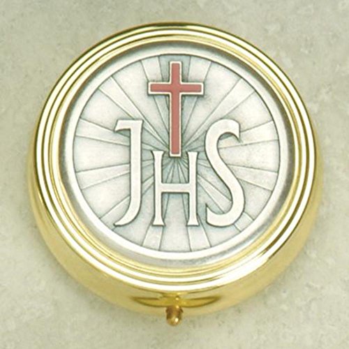 Religious Gifts Gold Plate Eucharist PYX with IHS and Red Enamel Cross, 2 1/4 Inch
