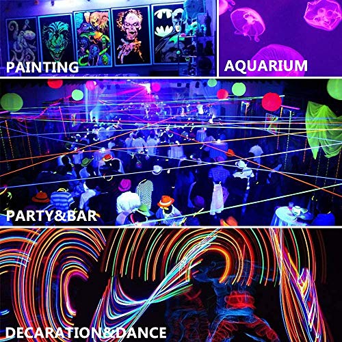 【FLUORESCENT REACTIVE】 Ideal for illuminating most reactive pigments, paints and dyes with black light. Especially with neon-colored objects, the blacklights work super cool for visible fluorescent materials, Ideal for blacklight and glow parties, clubs, bars, gyms, and holidays decorations.