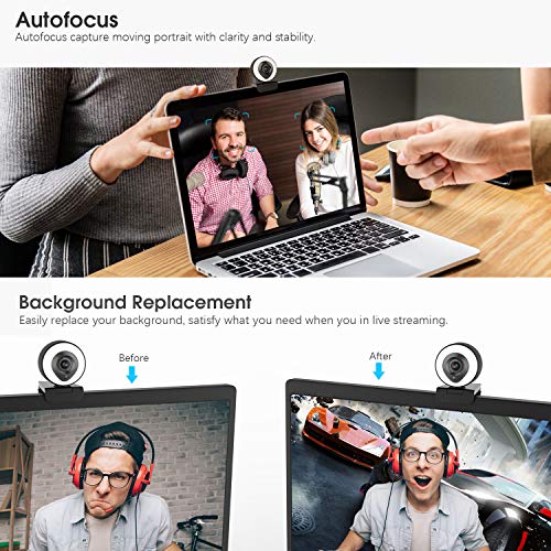 ❂AUTOFOCUS & SUPERIOR STEREO AUDIO — Automatic low-light correction provide true-to-life video even in dim lighting conditions, real time autofocus enables the webcam capture more details.Build-in dual stereo MICs with automatic noise reduction makes the sound clear.