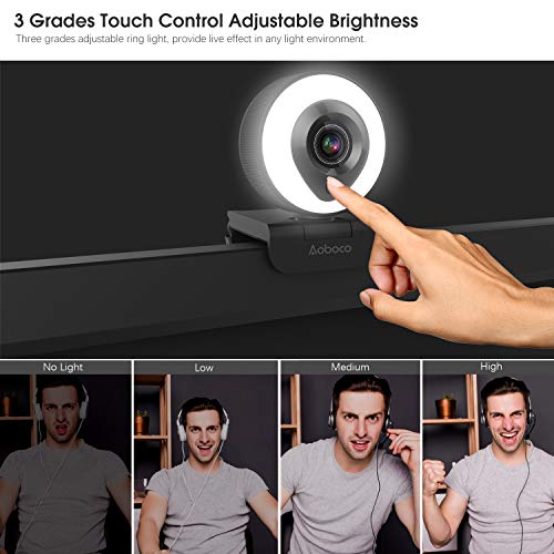 ❂PROFESSIONAL WEBCAM FOR STREAMING — Built-in ring light adjustable in 3 brightness with touch control, specifically designed and optimized for professional live streaming on social gaming and entertainment sites.presenting a perfect exposure, making you more confident and professional in live streaming There is no need for an additional lighting equipment. Tripod head design, support 360° rotation and 90° flip.