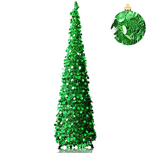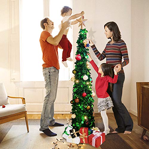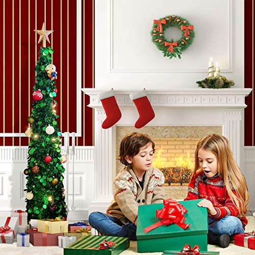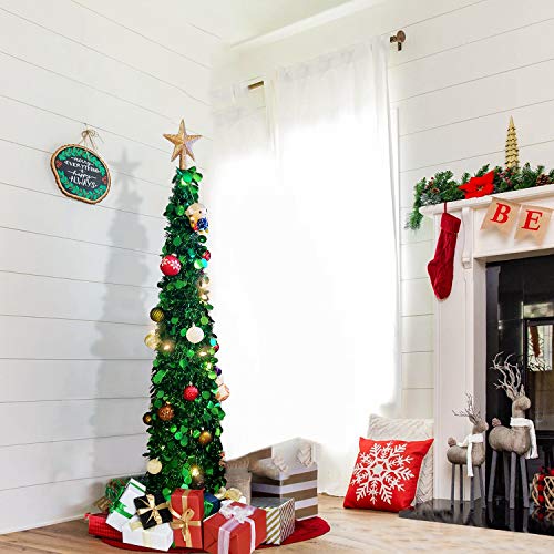 5FT Pop Up Christmas Tinsel Trees w/50 Colorful Lights, Collapsible Artificial Pencil Xmas Slim Tree w/Stand Easy…